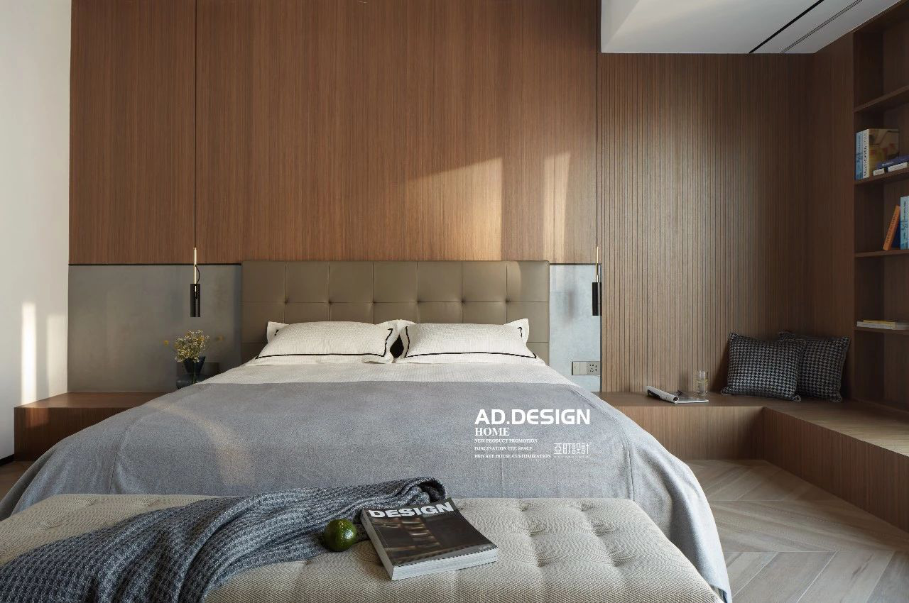 ▲卧室内大面积的格栅墙面使空间更有延伸感,靠窗的一组木质地台,可供日常休闲,在天气好的时节,倚窗而坐,倒上一杯红酒,享受家带来的一种极具精致的生活体验。