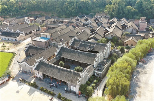 夕阳西下,暮色中的李家大院廊檐飞耸,灰白相间的瓦片映衬着院后如烟似黛的象牙山。常青的葱茏树木与错落有致的特色民宿交相掩映。