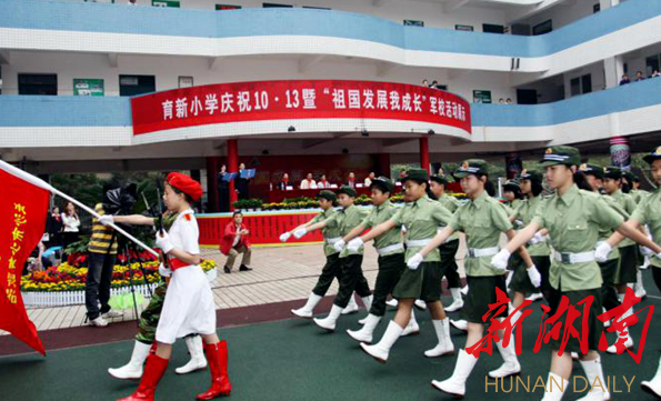 作为全国优秀少年军校,育新小学根据学生年龄特点,在低年级着重以生动活泼的形式,引导少先队员学习最初步的军事基础知识,通过讲人民军队的故事,让队员了解人民军队、热爱人民军队;中年级结合少先队活动、少年军校教育活动,了解人民军队的苦难辉煌历史;结合体育特色等项目,引导少先队员学习一些基本军事技能;高年级学习理解“听党指挥、能打胜仗、作风优良”的强军目标,讲讲国际形势,讲讲世界军事发展,培育国防观念、国家安全意识和忧患危机意识。