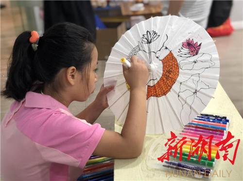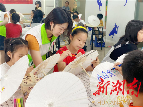 新湖南客户端8月11日讯(通讯员 陈希)为丰富辖区青少年暑假文化生活,让孩子们在社会实践中充分了解中国优秀传统文化,8月11日上午,长沙市芙蓉区马坡岭街道东站社区新时代文明实践站开展“手绘油纸伞,感受传统之美”绘画活动,活动邀请了怡乐艺术中心的专业老师授课,共有20余位小朋友参加此次活动。
