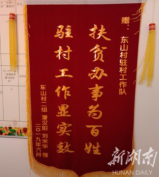 “扶贫办事为百姓,驻村工作显实效。”2019年6月,易敬贤老人来到东山村村部,亲手将一面锦旗送到驻村工作队办公地点,向李斌一再表示感谢。