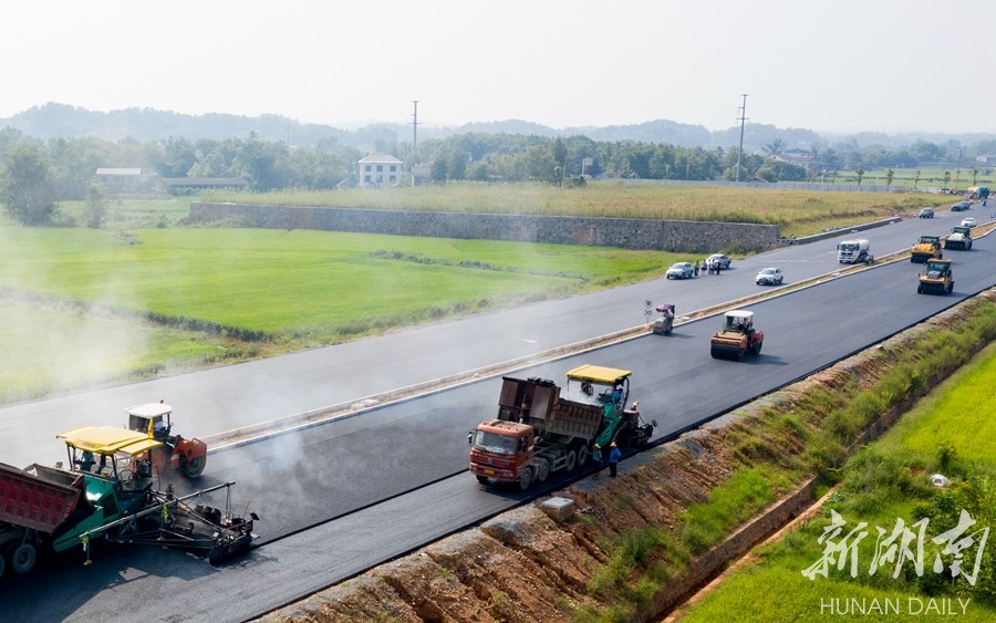 8月31日9时30分许,桃源县桃源大道施工现场,工人们顶着烈日铺设路面油砂。该大道是沅澧快速干线第四大道,北接柳叶大道,南连桃源火车站,全长28.08公里,设计时速为80公里,于2017年开始动工。目前,主体工程已接近尾声,将于今年国庆节建成通车。周桂成 摄