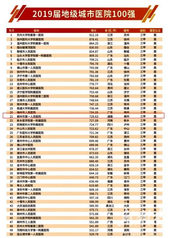 郴州市第一人民医院荣登全国地级城市医院排行榜第21位