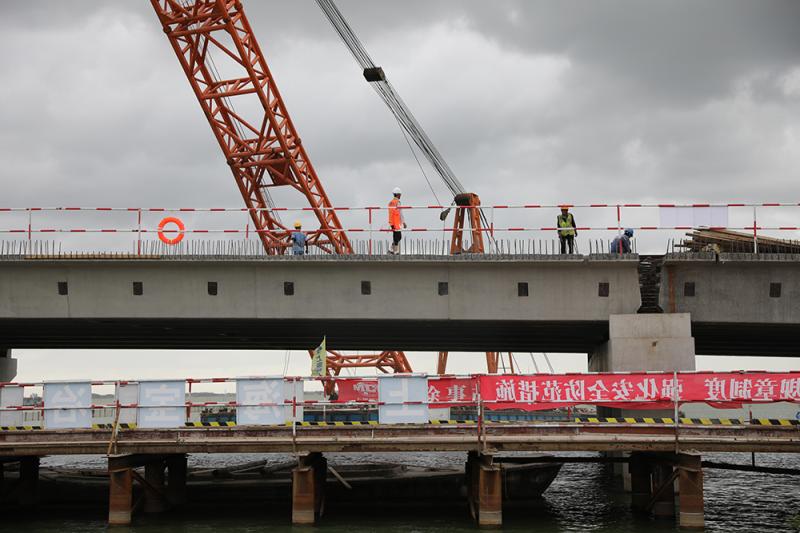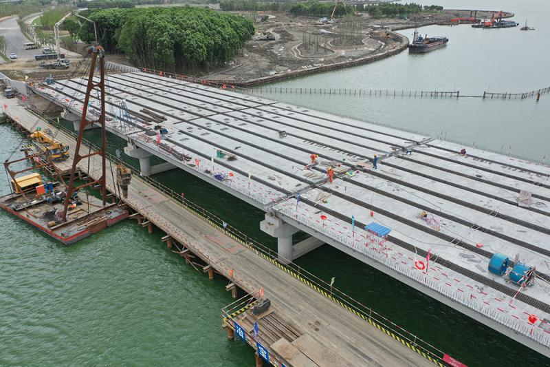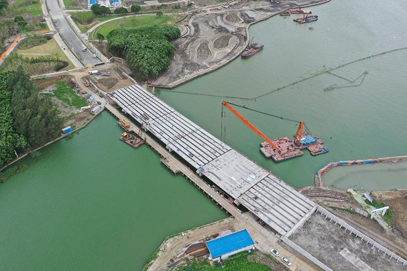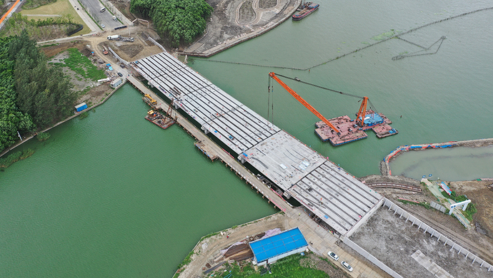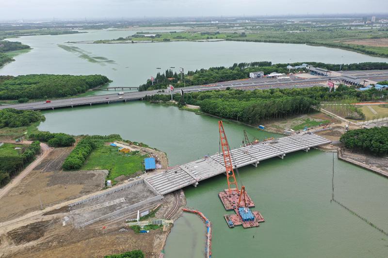 自今年3月10日青浦区东航路(沪青平公路-江苏省界)新改建工程(二标)项目开工建设以来,各参建单位克服新冠疫情、原材料运输道路狭窄、大型箱梁陆路运输不通、43天梅雨时长等种种不利因素带来的影响,组织技术攻关,优化施工方案,先后攻克“水上钢平台搭设与施工、大直径水中钻孔灌注桩施工、大跨径桥墩连系梁预制安装、大型箱梁水上运输及吊装”等多项重难点,促成大桥提前三个月合龙。
