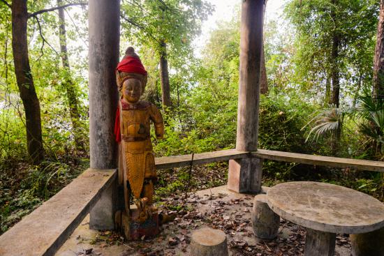 遗址成为保护地之后,农业生产基本停止。曾经有过一段时间想搞旅游,但并没有太多人过来。搞旅游时遗留的人工修建的亭子如今破败得像个文物。亭子里竖着一尊木雕神像,书记说是从沅江上游漂流而来的,被村民摆在了亭子里。