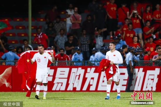 资料图:2022年世界杯亚洲区预选赛40强赛首战,中国队客战5球大胜马尔代夫队。归化球员艾克森(右)和李可赛后答谢到场的中国球迷。图片来源:视觉中国