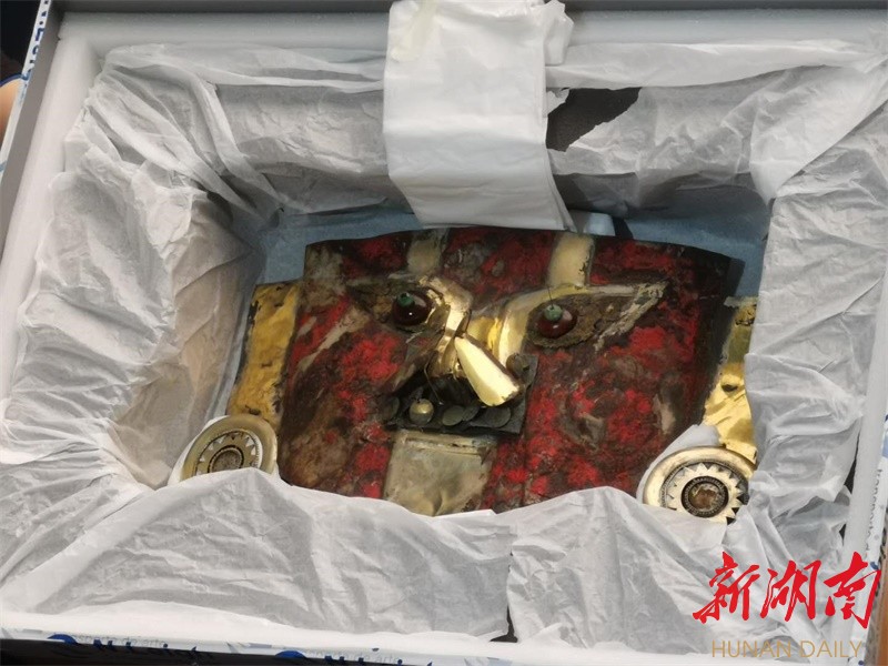 造型夸张的西坎文化罗洛神庙黄金大面具引起了在场记者们的好奇。这件黄金面具装饰着大耳饰、鼻饰,面具上涂了红色的朱砂。省博物馆馆员王卉介绍,独特的造型来源于西坎神,面具与西坎文化中的西坎神的面貌相同,暗示佩戴者具有神圣的权力和权威。面具的黄金含量依照佩戴者的身份等级而不同,地位最高的西坎贵族死后会戴着高纯度金质面具下葬。
