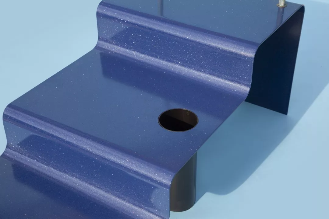 前面是大大小小的奶酪洞,这里是阶梯状的蓝色茶几,看上去像能滑滑梯一样,设计师真是设计鬼才!