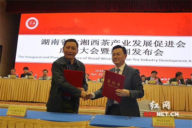 董事长陈德湖与湖南省大湘西茶产业发展促进会会长刘仲华签署“潇湘”品牌转让协议