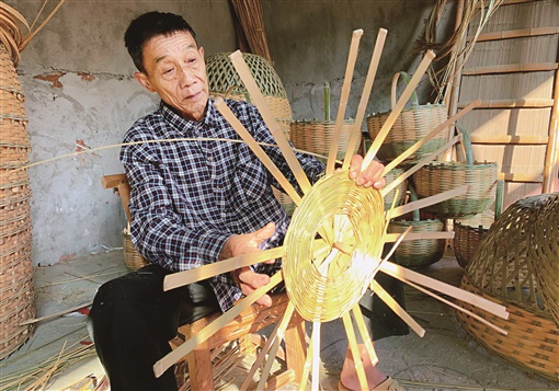 9月11日,汨罗市川山坪镇玉池山村,73岁的村民陈金阳在家中编织竹筐。湖南日报记者 徐行 摄