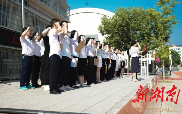 坚定的眼神、向阳的面庞、紧握的右拳,七年级主任曾丽玲带领七年级全体老师宣誓。彰显着瑶中教师们献身教育事业的决心!