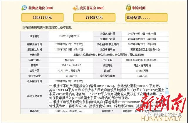 湖南日报•新湖南客户端9月30日讯(记者 郑旋 通讯员 彭娟)9月29日,位于长沙洋湖生态新城洋湖南[2020]长沙市071号地块由卓越京东(长沙)产业发展有限公司以15.48亿元竞得,记者了解到,未来,该地将引入京东南方科创总部及京东超级体验店。