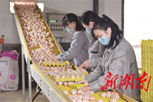 (9月22日,湘乡市泉塘镇花西村花西农牧有限公司鸡蛋分拣包装车间,刚产出的鸡蛋通过自动生产线源源不断输送到车间,工人们在熟练地进行分拣、包装。湖南日报记者 徐行 摄)