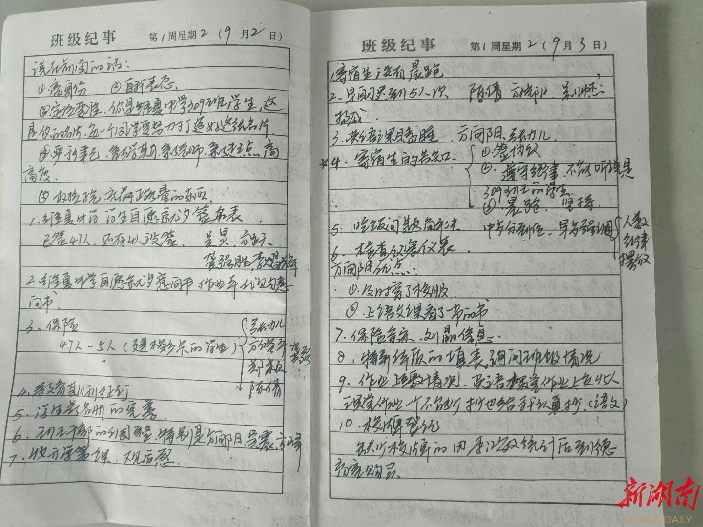 自从当上309班班主任,易强就养成了写班主任工作日志的习惯。事无巨细,包括学生几时几分到校、晨读、课间操、午休、就餐、卫生、离校、就寝、作业完成情况,他都记得清清楚楚。