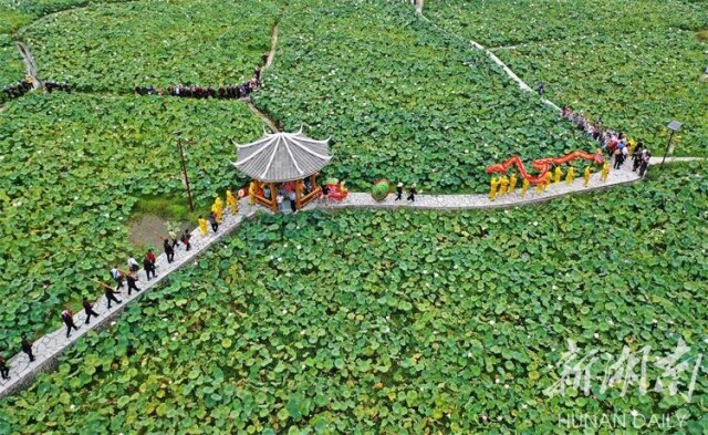 8月22日,罗武村举办首届荷花文化节,吸引1000多名游客前来赏荷。侗寨的阿哥阿妹们进行了一场极具侗族特色的文艺汇演。游客们流连于花海间,赏花、拍花,将美好定格在方寸之间。拦门酒、舞龙、打糍粑等民俗特色让游客乐在其中。同时,侗寨风雨桥上,新鲜采摘的莲蓬,以及荷叶茶、莲芯茶、茶油、蜂蜜、荷包香囊等当地农产品,也受到游客青睐。截至目前,罗武村通过线上线下销售农产品,已实现收入20余万元。