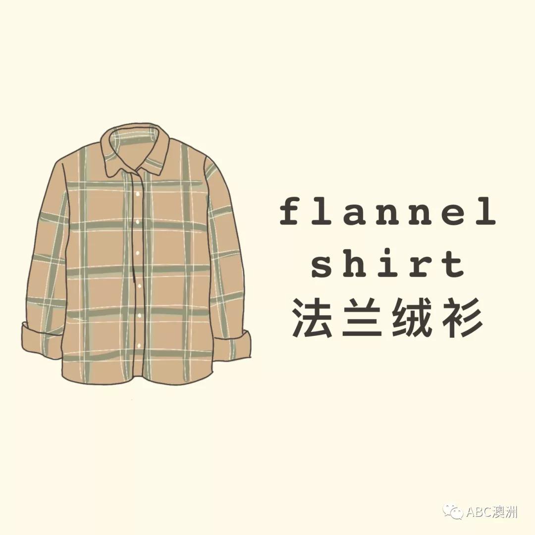 Flannel的中文即“法兰绒”,它是一种类似于棉质的布料,也是很多常见的格子衫使用的布料。除此之外,fleece或者wool也是市面上很常见的布料,它们分别指的是羊毛和绒头织物。这两个词的常见固定表达是:羊毛外套fleece jacket或羊毛衫wool sweater。