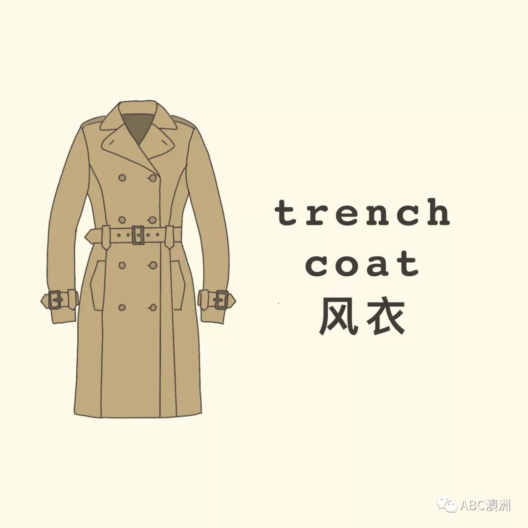 Trench coat指的是风衣,和大衣不同的是trench coat的材质通常是防水的,不是棉质的。
