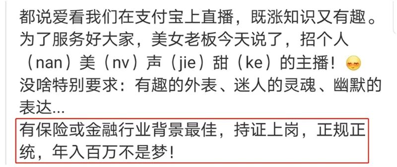 最近,某互联网保险公司甚至还发出“英雄帖”,开出百万年薪招募保险业的“薇娅、李佳琦”,要求主播兼具“有趣的外表、迷人的灵魂、幽默的表达”,一时引起广泛关注。