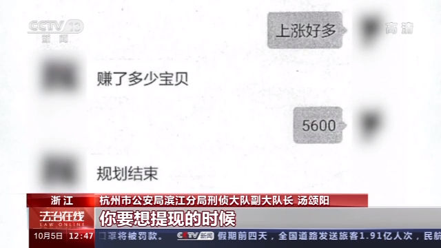 杭州市公安局滨江分局刑侦大队副大队长 汤颂阳:后台掌控在他们自己手里的,内容里面就是押大押小的,我们称之为博彩类的杀猪盘。所以会导致让你赢就赢,让你输就输。你要提现的时候,他想让你提就可以提出来,不想让你提出来就提不出来。