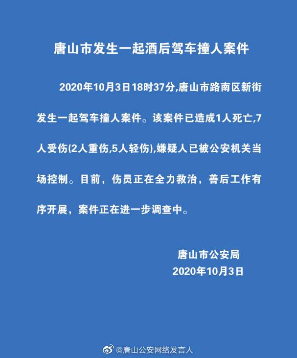 唐山发生一起酒驾撞人案件致1死7伤,嫌疑人被控制