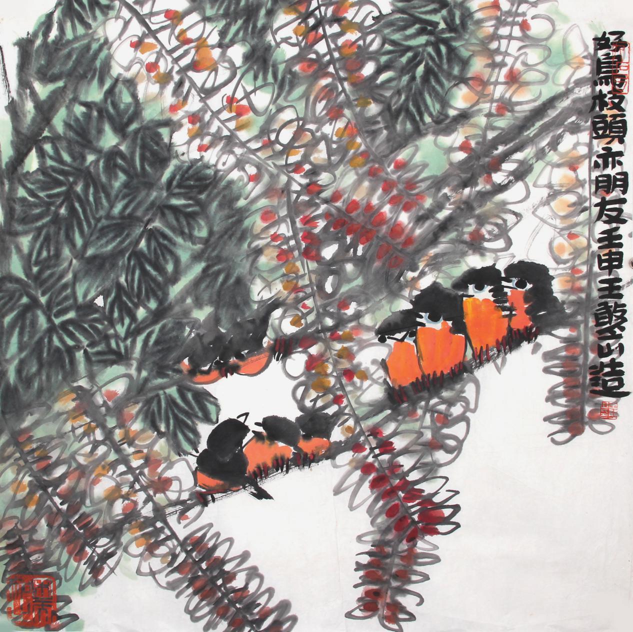 传统文人写意花鸟的笔墨精神在上世纪八十年代后遭遇西方现代绘画造型意识的强烈冲击。在中国传统绘画中,文人写意花鸟的现代性其实是相当强烈的,只是我们许多画家和史论家没有关注和阐扬而已,当八十年代的现代美术思潮洪水般涌来时,王憨山虽贫居山野,但他敏锐地把捉到了西方现代绘画中的造型意识对他的中国写意花鸟画的革新可能有助。事实上,我们翻看王憨山的创作手稿可以得知,他的画风的彻底改变与确立是在八十年代,确切地说是在1985 年之后,经过十年的时间,在九十年代中期,达到成熟境界,这个时间恰巧与中国现代美术思潮同步,它绝对不是偶合,而是王憨山与时代的共同律动。1983 年画的麻雀与小鸡还墨分五色,讲究传统笔墨的所谓“墨韵”,在造型上也还没有脱离写生的“真实”,到1985 年,造型上趋于抽象,只保留并夸张几个基本特征,笔墨上开始扬弃“墨分五色”,大胆用中锋圆线勾勒轮廓,在画面中用中锋圆线画出几根支撑构图的长线并切分画面,再铺上大片略显几何形状的色块或墨块,最后题上用中锋圆线书写的方方直直的憨山体楷隶书,完成对画面的艺术编程。可以说,王憨山把八大山人、齐白石和潘天寿以来,文人写意花鸟画的空间意识进一步向前推进了,而这一推进,是受到了85’美术思潮的现代激荡,同时又内在地原发于中国文人写意花鸟画的传统空间意识与高妙的造型理念。王憨山强化了写意花鸟画的平面性,弱化了写意花鸟画笔墨的复杂性,简化了造型、笔墨、色彩上的许多因素和细节,并把题跋文字和书法在构图中的地位提高到前所未有的分量和比重,同时在全画中从题跋文字到结构长线到物象造型,都顽强地坚决地贯彻他那标志性的中锋圆线,形成个性化极强的识别符号,所有这些,都是一种“现代性”的努力,所以,在徐渭、八大、石涛、金农、赵之谦、吴昌硕、齐白石、潘天寿、王憨山这个明清以迄现代的文人写意花鸟画大师序列中,王憨山确实显得更现代,他在他的这个时代,吸纳新的时代气息,延续并拓展了伟大的中国写意花鸟画传统。这是王憨山独有的条件,他以开放的心态积极地迎受了现代艺术的洗礼却又并没有失去中国水墨写意的精神。