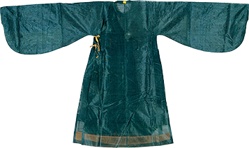 其中展出的绿色素纱女袍为命妇常服。圆领、大襟右衽、宽袖,左右两侧开衩,下摆前短后长,后片底摆边角向外对折再向后折返钉缝于衣身上。此袍前胸后背留有缀方补痕迹。