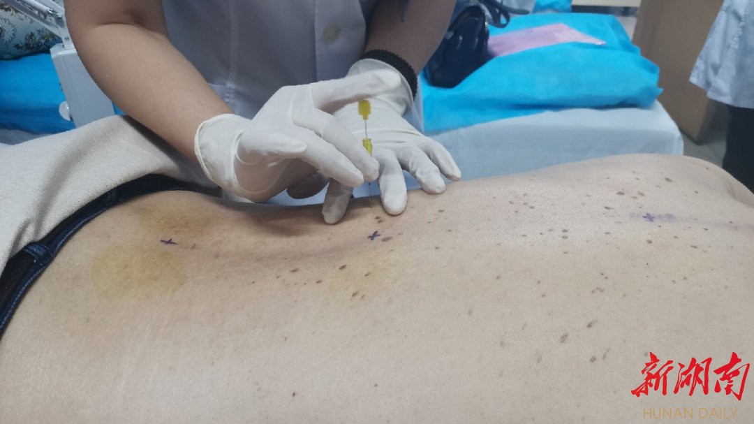 图为医生在为患者实施穴位埋线疗法