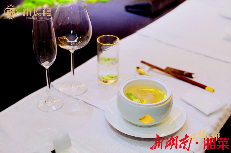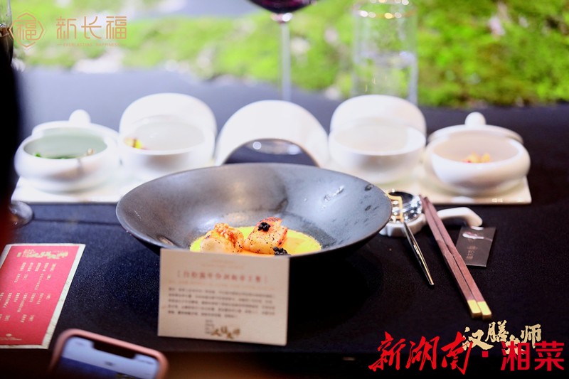 由新长福研发的这道“汉膳大师”宴,精选了14道美食。拉鱼子酱甜豆、烧椒海螺片、桂花糯米藕、妈妈萝卜条等4道凉菜,关联着“春夏秋冬”,暗合“四季吉祥”之意。以汤泡菊花蚌作为餐前汤,以松茸蕴含其珍贵,以象拔蚌彰显其富贵,以菊花昭示其精神。6道主菜堂煎M9和牛,中式烹饪技巧和世界食材的绝妙融合;白松露年份剁椒帝王蟹,湖湘传统食材与世界食材的激情碰撞;酸辣鳘花胶,经典的湘菜味型唤醒味蕾的记忆;辣椒炒海参,新长福畅销12年的“湘派海鲜”代表作;紫苏拆烩洞庭鱼头,来自鱼米之乡的馈赠;蟹粉扒豆苞 ,诠释不时不食的养生哲学。最后,还有特色松茸肉包和湘莲安南子燕窝作为整场宴会的完美收官之作,给人意境幽深、回味悠长的感受。