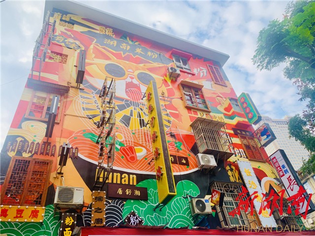 10月27日,正值午餐高峰期,记者来到“湖南米粉街”,提质改造后的传统老街旧貌换新颜,映入眼帘的是一口超大的青花瓷碗,搭配着一双精致的大红筷子夹着许多白嫩粉条,吸引不少人驻足拍照。