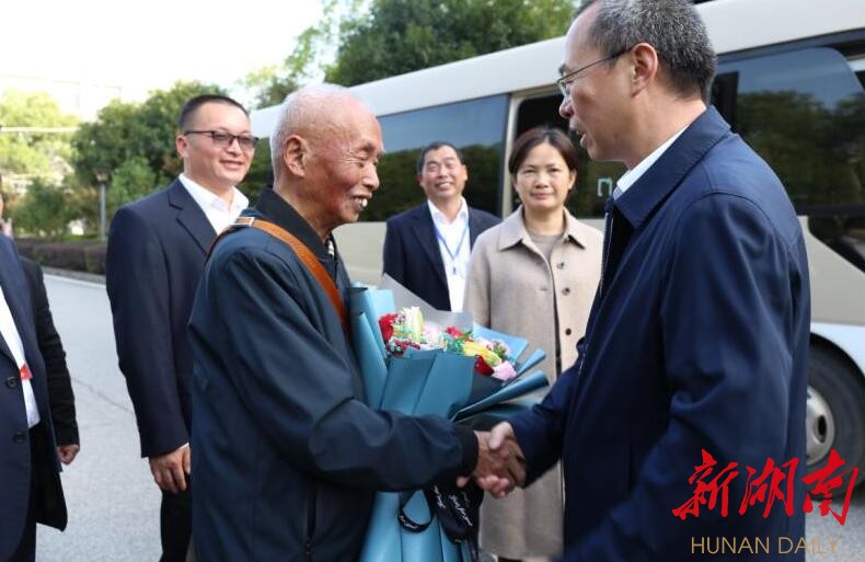 为了迎接向院士的到来,平江五中特地把他当年的班主任、现已87岁高龄的李谦益老师请回了学校。阔别多年,今天终于再度重逢,师生俩都抑制不住内心的激动,在向院士深深一躬之后,两双手便紧紧地握在了一起。