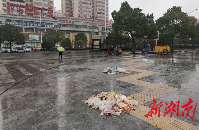 10月26日早晨7点20分许,记者第二次来到该地,发现地上的垃圾已经扫拢成堆,还没来得及清运走。当天刚下过小雨,地面湿滑,市民走到此处特别小心,“有的地面有油污,一不小心就会滑倒摔伤。”市民陈女士说。