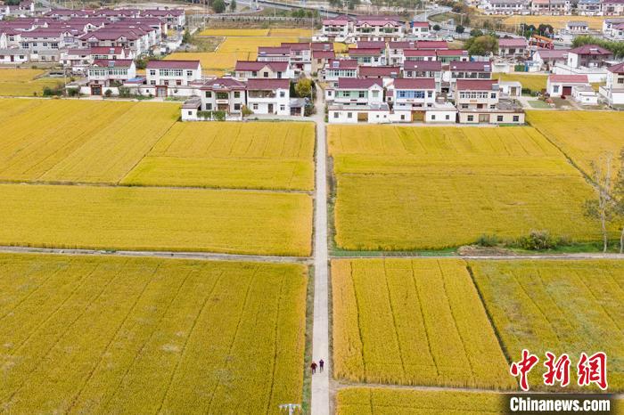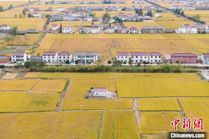 10月29日,航拍江苏省淮安市农村,水稻与民居交错,形成了一幅“金色家园”美丽画卷。