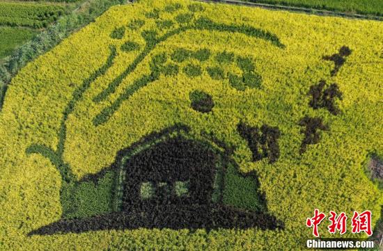 航拍五彩稻田内的丰收节图案。(中新社记者 王刚 摄)