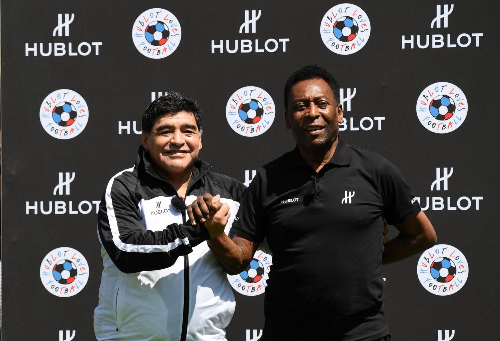 ↑2016年6月9日,马拉多纳(左)和贝利在法国巴黎举行一场商业表演赛前握手致意。