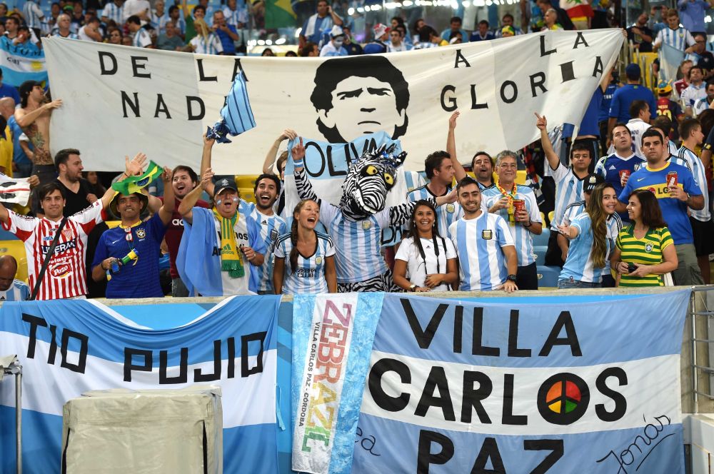 ↑2014年6月15日,在2014年巴西世界杯小组赛阿根廷队对阵波黑队的比赛前,阿根廷球迷赛前打出印有马拉多纳西头像的横幅,为球队加油助威。