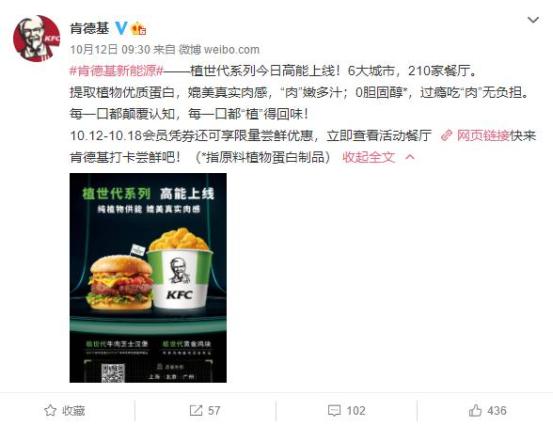 10月12日,知名餐饮品牌「肯德基」率先在北京、上海等城市推出了自己的人造肉产品。