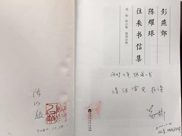 陈以敏和易彬历时八年整理,终成一书——《彭燕郊陈耀球往来书信集》;