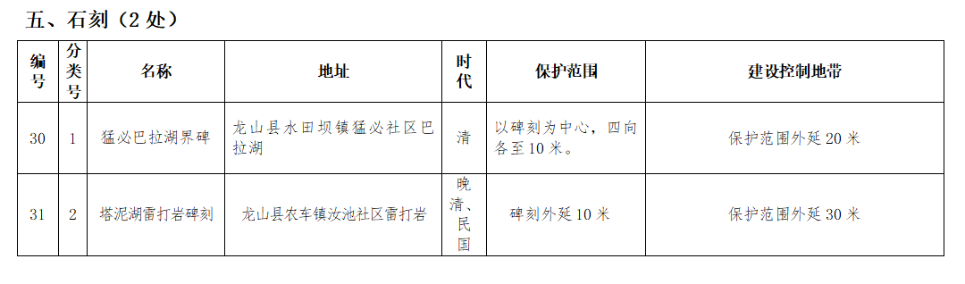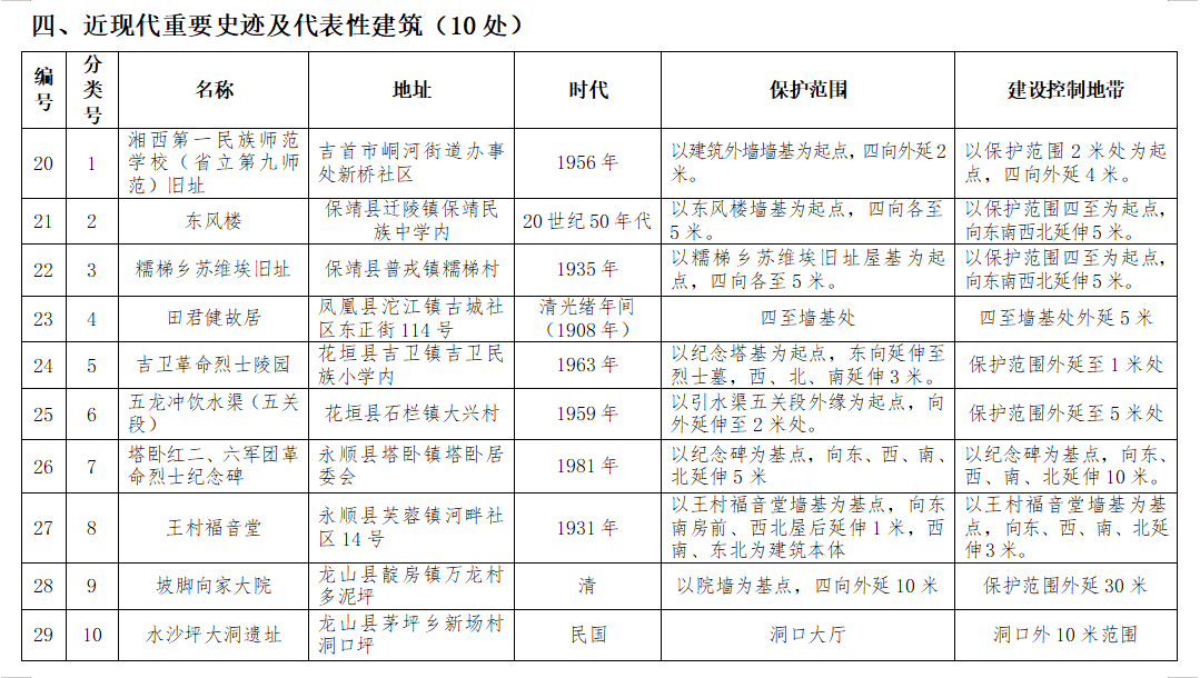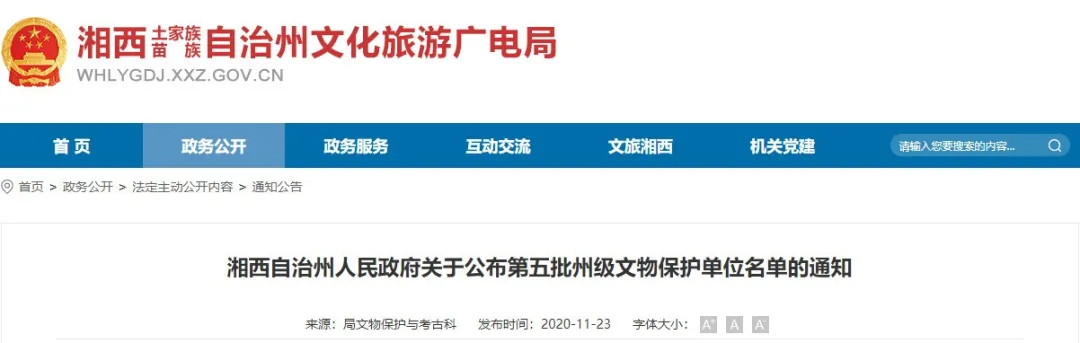 为进一步贯彻“保护为主、抢救第一、合理利用、加强管理”的文物工作方针,近日,湘西土家族苗族自治州人民政府在全州范围内开展第五批州级文物保护单位申报评审工作,确定喜鹊营遗址等31处具有较高历史、艺术、科学价值的文化遗产为第五批州级文物保护单位,并划定保护范围和建设控制地带,现予公布。