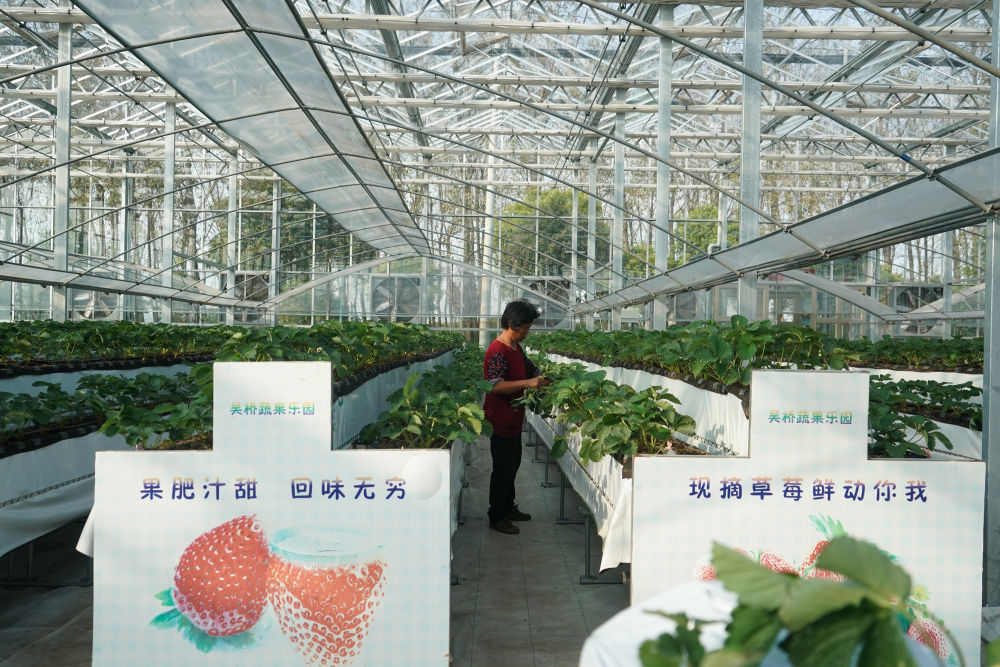 10月29日,在江苏江都现代农业产业园电气化大棚,农民在对草莓进行日常管护。新华社记者 季春鹏 摄