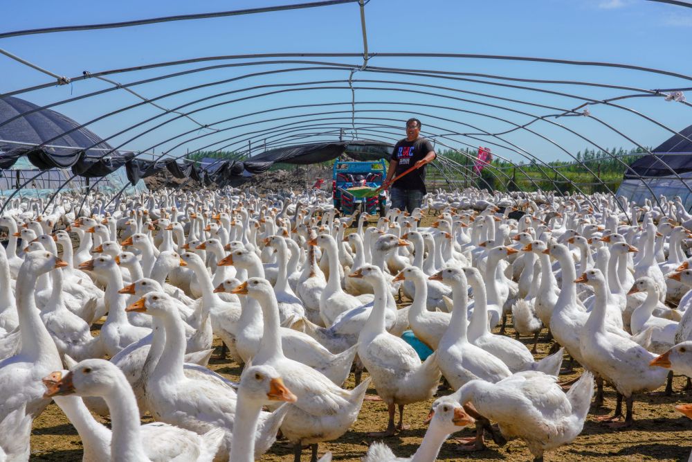 8月12日,在吉林镇赉县黑鱼泡镇岔台村,村民王木尧在投喂鹅饲料。新华社记者 张楠 摄