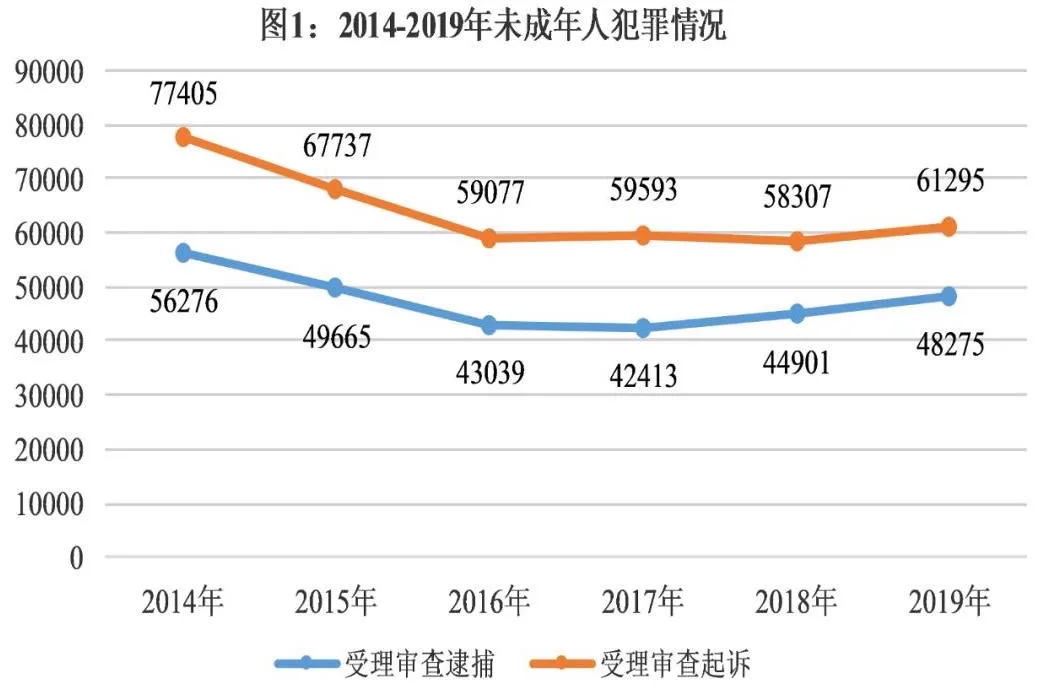 2014-2019年未成年人犯罪情况(图源:《未成年人检察工作白皮书(2014—2019)》)