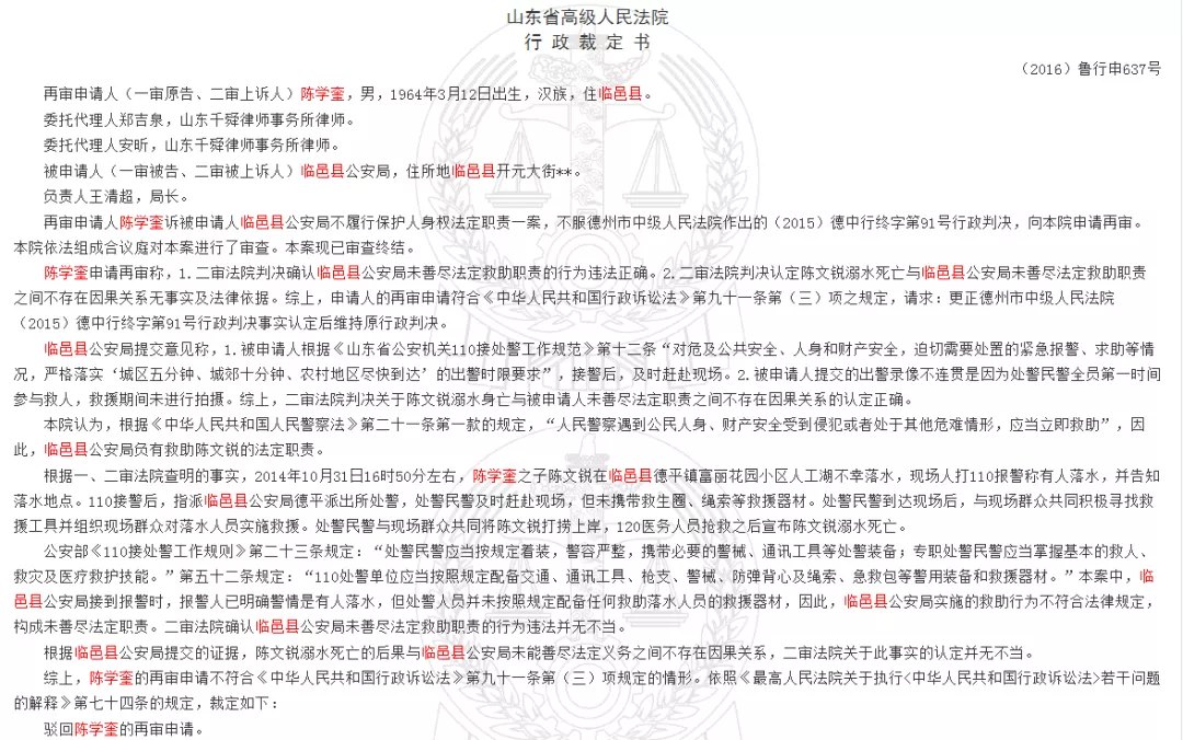 事后,落水男子父亲以行政不作为将警方告上法庭。最终,山东省高院判定,临邑县公安局接到报警时,报警人已明确警情是有人落水,但处警人员并未按照规定配备任何救助落水人员的救援器材,因此,临邑县公安局实施的救助行为不符合法律规定,构成未善尽法定职责。