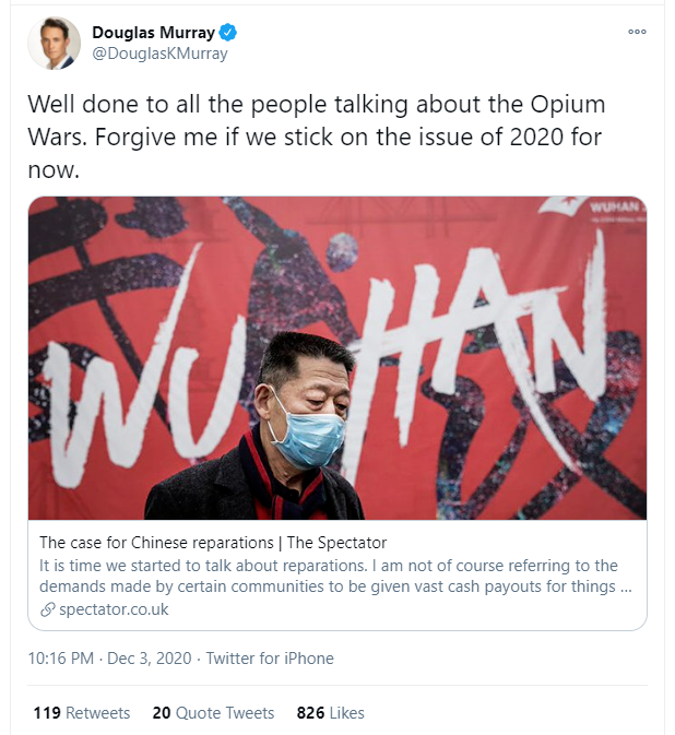 更恶劣的是,当有人质问这个英国右翼公知当年英国在鸦片战争中欺辱中国的行为时,这个公知居然宣称,今天的英国人不该再为100多年前的事情负责,但新冠疫情发生在2020年,所以中国应该赔偿。