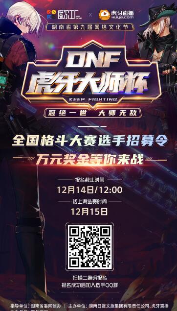2020年12月,首个全方位全平台DNF端游顶尖赛事-DNF虎牙大师杯全国格斗大赛将作为湖南省第九届网络文化节电竞赛事单元正式落户湖南长沙,为璀璨星城再添电竞光芒!