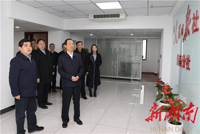 (12月9日下午,省委书记许达哲在省委宣传部和部分中央驻湘新闻单位走访调研。图为许达哲走访人民日报社湖南分社。)