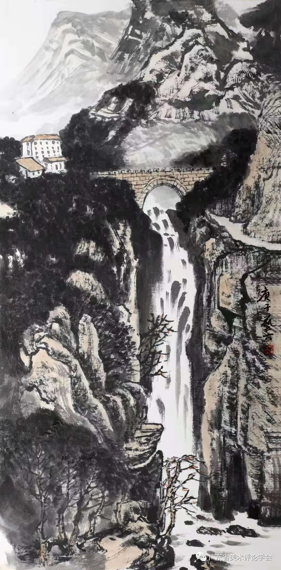 从画家肖艺六溢情豪迈的画作中,我们也能感知到传统的文脉之来源。山体坚凝、气象万千,喜作全景,显然取法于北宋山水画的写实造境和崇高;近看“干枯浓淡随之,疏密有无任之,随心所欲而不逾矩”,亦有四王笔墨总结性技法的深刻影响。在看似传统的点、线、墨、色中,融入了个人强烈的主观审美意识,他用一种当代人的智慧与心性给予这种传统理法以新的诠释。画家在叩问笔墨,叩问经典,更是在叩问自然。经过反复的叩问,在大胆汲取北方山水画浑厚雄奇的基础上,掺和南方山水画的清灵气息,求质朴、求率真、求纵横,用粗犷的山水画语言在古雅的风格中流溢出一种清新的气象,形成了自我北骨南肌、雄强浑厚的个人风格。笔墨酣畅,浑厚华滋,境界阔大,浑茫深邃,显然这是画家个体生命在经历了时光的淘洗锤炼之后,自然而然所焕发出的一种本真精神与本能追求。其笔下的山水,不管在笔法、墨法、章法上,骨法挺拔、章法严谨、笔墨潇洒淋漓,仿佛从远处拂来一股古朴、浑厚、清穆之风。这种根源于中国古代《诗经·国风》的美学思想的表现形式,是肖艺六师法自然,缘情悟道的体现,藉自身对自然独特之视角,诠释了情景交融之美,令其作品始终弥漫着厚土关山之感。这也正是中国传统绘画的风骨所在,是画家“即景会心、随物宛转”的优游自信,以及“披图幽对,坐究四荒” 的精神秉持。
