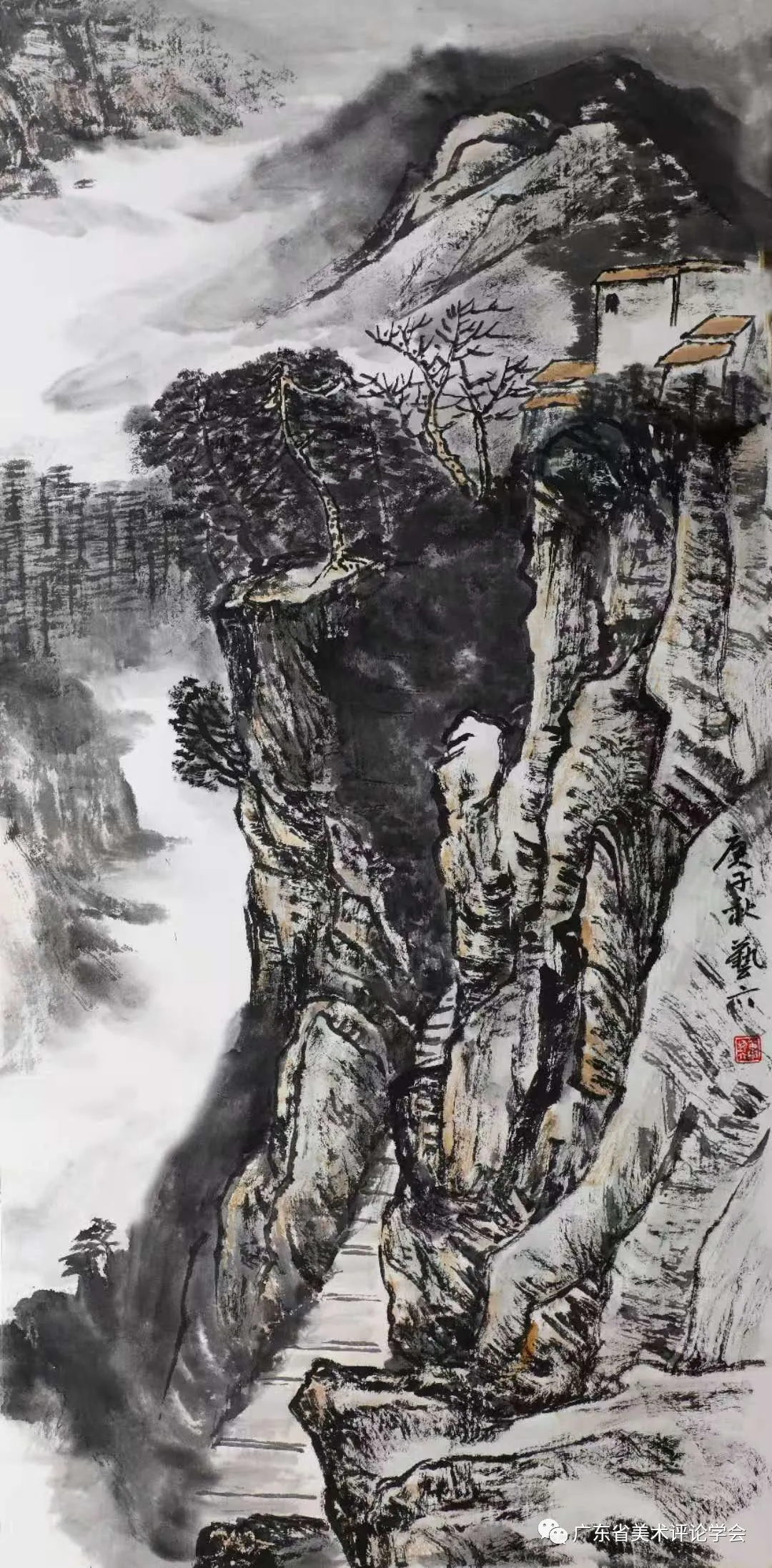 虽是素朴雄浑,然细观肖艺六画作,却是笔笔生发,墨彩焕然,笔墨交汇渲染及层层叠加,自然而生山川坚实、雄奇醇厚的画面效果,既有恣肆的动势,放眼却又尽是深邃幽冥的宁静。在动与静之间,尽是天籁,气势磅礴,完成了情景再造,构建出物我共生的特殊艺术空间。自然山水之浸润,人文精神之渗透,终归于笔墨的表达。遣笔绘景,任心纵逸,群山林莽,关山强雄,落笔沉厚,传情达意自然和谐,颇有“独与天地精神往来”之神合,创造出夺人魂魄的力量,这种精神力量也必然会反映出一种意境,故而灵气四溢,逸气纵飞,其情其景,令人心醉。但这种意境并不是一种脱俗的逃离,而恰是在为祖国山河立传,是在用真爱感悟山河,用真情拥抱生活,将真情倾注于艺术创作,用画笔畅叙自然造化。