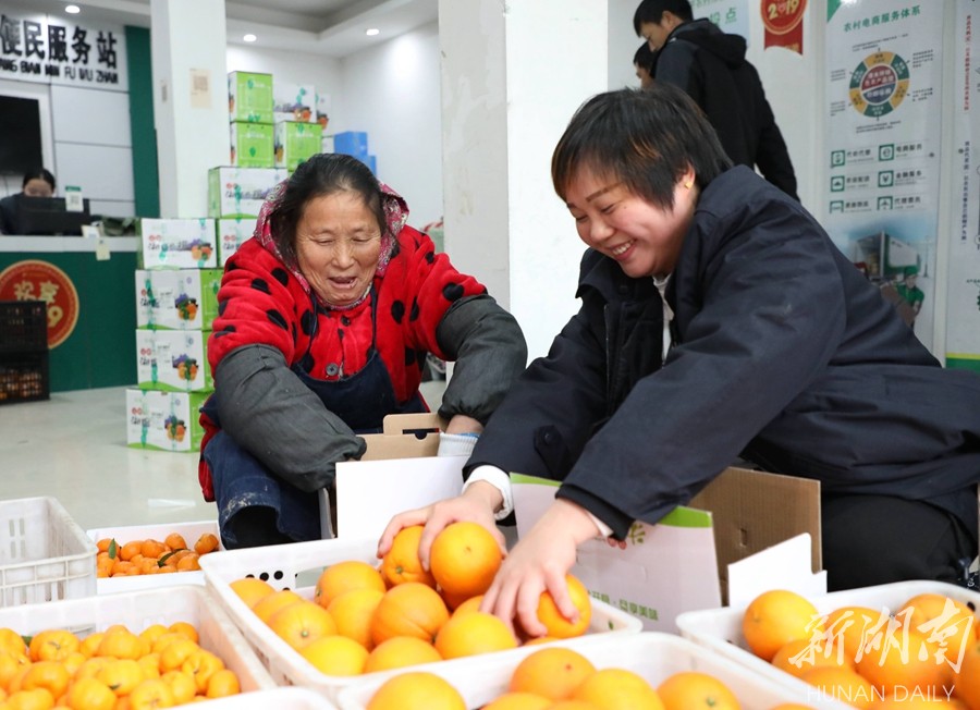 12月7日,保靖县清水坪镇邮政农村电商便民服务站,工作人员在为果农包装柑橘准备销售。近年,该县把产业扶贫与农村电商结合起来,实施“电商+产业+服务”发展路径,使当地的水果、蔬菜等农产品及时外运、保鲜销售,帮助农民脱贫致富拓宽了渠道。俞采华 彭薇 摄影报道