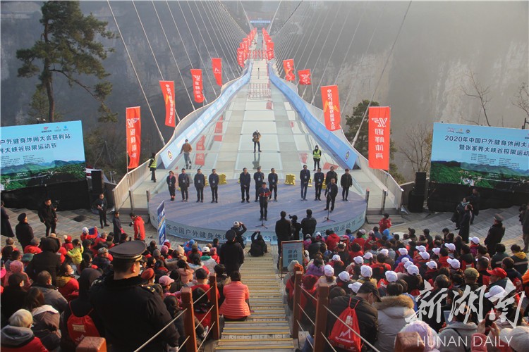 12月20日,2020年中国户外健身休闲大会慈利站暨张家界大峡谷极限运动隆重举行。来自全国各地的极限运动爱好者齐聚张家界大峡谷景区,在玻璃桥上共同竞技。