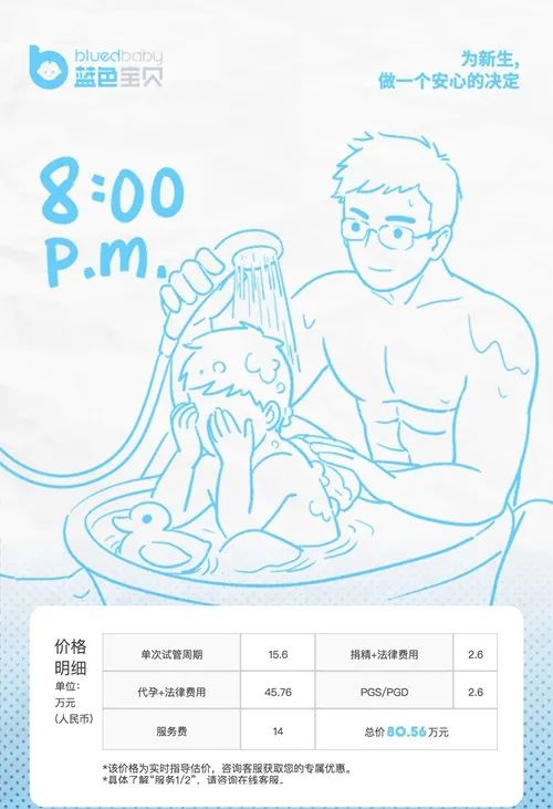 在蓝色宝贝官网上,“海外DIY生娃攻略”的浮窗格外引人注目。客户不仅能挑选代孕母亲,还可以“定制”宝宝性别,“要个男宝宝、女宝宝、龙凤胎?”“价格一目了然,童叟无欺”……记者注册登录后,根据“报价计算器”的指引,在选定宝宝性别、数量、出生国家等一系列选项后,得到了80.56万元的报价,以及一张清晰的价格明细表。